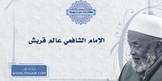 الحمد لله رب العالمين والصلاة والسلام على سيدنا محمد وعلى ءاله الطيبين الطاهرين. أما بعد، فإن رسول الله صلى الله عليه وسلم روى عنه أنه قال:” لا تسبوا قريشاً فإن عالمها يملأ طباق الأرض علماً”. معنى هذا الحديث أنه سيأتي عالم من قريش يملأ جهات الأرض علماً، ففكر العلماء على من ينطبق هذا الحديث فوجدوه ينطبق على الإمام الشافعي لأنه من قريش، أما الثلاثة الآخرون مالك وأحمد وأبو حنيفة فليسوا من قريش. ففسّر العلماء الحديث بالشافعي والأمر كذلك لأن مذهبه انتشر في الشرق والغرب والشمال والجنوب إلى يومنا هذا. الشافعي كان عالماً فقيهاً محدّثاً مجتهداً واسمه محمد بن إدريس توفي سنة مائتين وأربعة، كان رضي الله عنه حسن الصورة حسن الصوت حتى إن بعض الناس لما يريدون أن يسمعوا قراءة القرءان على الوجه الصحيح الذي فيه ترقيق القلب يذهبون إليه يقولون: