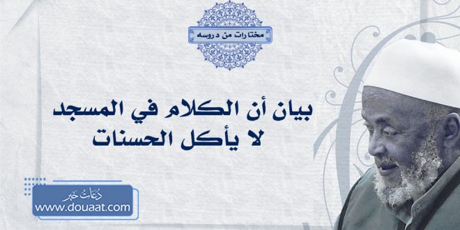 فَقَدْ وَضَعَ الْكَذَّابُونَ حَدِيْثينِ على رَسُولِ اللَّهِ صَلَّى اللَّهُ عَلَيْهِ وَسَلَّمَ لاَ أَصْلَ لَهُمَا، أَحَدُهُمَا: “الْكَلاَمُ في الْمَسْجِدِ يَأْكُلُ الْحَسَنَاتِ كَمَا تَأْكُلُ النَّارُ الْحَطَب”، هَذا الْحَدِيثُ مَوْضُوعٌ مَكْذُوبٌ عَلَى رَسُولِ اللَّهِ صَلَّى اللَّهُ عَلَيْهِ وَسَلَّمَ يَجِبُ إِزَالَتُهُ عَلَى مَنْ رءاهُ في مَسْجِدٍ مِنَ الْمَسَاجِدِ فَإِنَّ ذَلِكَ كَذِبٌ عَلَى الرَّسُولِ. ثُمَّ مَعْنَاهُ فَاسِدٌ لأَنَّ الْكَلاَمَ في الْمَسْجِدِ حَصَلَ في زَمَنِ النَّبِيِّ صَلَّى اللَّهُ عَلَيْهِ وَسَلَّمَ بِمَا لَيْسَ بِذِكْرٍ لِلَّهِ تَعَالى وَلاَ تَعْليمِ عِلْمٍ. ففي صَحيحِ الْبُخَارِي أَنَّ اثنين مِنَ الصَّحَابَةِ كَانَ أحدُهما لَهُ دَيْنٌ عَلَى الآخَرِ فَتَقَاضَاهُ صَاحِبُ الدَّيْنِ، حتى ارْتَفَعَتْ أَصْواتُهُمَا فَقَالَ رَسُولُ اللَّهِ صَلَّى اللَّهُ عَلَيْهِ وَسَلَّمَ لِصَاحِبِ الدَّيْنِ: يَا كَعْبُ (هو اسْمُهُ كَعْبُ بْنُ مَالِك)، فَأَشَارَ لَهُ إِشَارَةً أَنْ يُسْقِطَ عَنْهُ نِصْفَ الدَّيْنِ. الشَّاهِدُ في هَذَا الْحَدِيثِ أَنَّ الرَّسُولَ صَلَّى اللَّهُ عَلَيْهِ وَسَلَّمَ لَمْ يُنْكِرْ عَلَيْهِمَا، لَمْ يَقُلْ لَهُمَا كَيْفَ تَتَكَلَّمَانِ في الْمَسْجِدِ بِأَمْرٍ مِنْ أُمُورِ دُنْيَاكُمْ، كَيْفَ تَتَكَلَّمَانِ بِغَيْرِ ذِكْرِ اللَّهِ، بِغَيْرِ تِلاَوَةِ الْقُرْءانِ، بغيرِ ذِكْرٍ لِلَّهِ تَسبيحٍ أو تحميدٍ أو تكبيرٍ أو نحوِ ذَلِكَ كَمُذَاكَرَةٍ في الْعِلْمِ الشَّرْعي. وَمِنْ هَذَا الْحَدِيثِ الصَّحِيحِ الَّذِي رَوَاهُ الْبُخَارِيُ وَغَيْرُهُ نَأْخُذُ حُجَّةً عَلَى جَوَازِ الْكَلاَمِ في الْمَسْجِدِ بِأُمُورِ الدُّنْيَا وَأَنَّ ذلِكَ لَيْسَ بِحَرَامٍ، إِنَّمَا الْحَرَامُ مَا كَانَ حَرَامًا مِنَ الْكَلاَمِ في غَيْرِ الْمَسْجِدِ فَهذا هُوَ الْحَرَامُ، إِلاَّ إِذَا كَانَ هَذَا الْكَلاَمُ يَحْصُلُ بِهِ تَشْوِيشٌ عَلَى مُصَل أَوْ عَلَى قَارِىءٍ، فَإِنْ كَانَ في الْمَسْجِدِ تَالٍ يَتْلُو الْقُرْءانَ أَوْ مُصَلّ حَرُمَ التَّكَلُّمُ بِجَانِبِهِ بِحَيْثُ يَتَشَوَّشُ الْقَارِئ أَوْ الْمُصَلِـّي فَإِنَّ ذَلِكَ حَرَامٌ . هَذَا يَشْمَلُ مَا إِذَا كَانَ الْكَلاَمُ الَّذِي يُشَوِّشُ عَلَى الْمُصَلِـّي أَوْ الْقَارِىءِ مُذَاكَرَةً في الْعِلْمِ أَوْ ذِكْرًا أَوْ غَيْرَ ذَلِكَ فَإِنَّ ذَلِكَ حَرَامٌ. فَمَنْ دَخَلَ المسجدَ فَوَجَدَ مُصَلِـّيًا أَوْ تَالِيًا يَتْلُو الْقُرْءَانَ حَرُمَ عَلَيْهِ أَنْ يُشَوِّشَ عَلَيْهِ سَوَاءٌ كَانَ بِكَلاَمٍ عَادِيٍّ دُنْيَوِيٍّ أَوْ بِتِلاَوَةٍ أَوْ غَيْرِ ذَلِكَ، إِنْ كَانَ يُرِيدُ تِلاَوَةً فَلْيَتْلُ بِحَيْثُ لاَ يُشَوِّشُ عَلَى ذَلِكَ التَّالي وبِحَيْثُ لاَ يُشَوِّشُ عَلَى الْمُصَلِـّي.