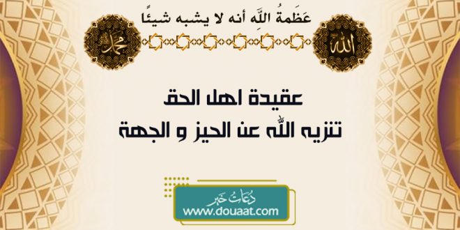 و نرفع الأيدي في الدعاء إلى السماء لأنها مهبط الرحمات و البركات، و ليس لأن الله موجود بذاته في السماء كما أننا نستقبل الكعبة الشريفة في الصلاة لأن الله أمرنا بذلك، و ليس لأن الله ساكن فيها. فمن يعتقد بأن الله موجود بذاته في الجنة التي هي فوق السماوات السبع أو أنه فوق العرش يلامسه أو فوقه بالمسافة، أو إعتقد أنه بذاته في السماء أو في كل مكان أو في مكان معلوم أو في مكان مجهول فإنه كافر بربّه ليس بمسلم و لا مؤمن و إن زعم أنه مسلم مؤمن، إذ أنه من المعلوم القطعي أن الشخصَ لا يكون مسلماً لمجرد ظنه بنفسه أنه مسلمٌ، بل لا بد أن يخلو قلبه عن كل إعتقاد فيه نسبة النقص إليه سبحانه و تعالى. و لا يعذر في هذا الجاهل لجهله إذ أن نسبة الجهة و المكان لله تعالى تنقيص لله و تشبيه له بخلقه. فالجاهل الذي يزعم أنه يعبد الله و هو يعتقد بأن الله موجود بذاته في جهة من الجهات الست أو في مكان ما فهو بعيد عن الإيمان و هو يعبد مخلوقاً من حيث لا يشعر، إذا لو كان يعبد الله حقاً لنزهه عن الجهة و المكان. و قال الإمام التابعي الجليل ذو النون المصري رضي الله عنه: “مهما تصورت ببالك فالله بخلاف ذلك”، و قال الإمام أبو جعفر الطحاوي في العقيدة المشهورة: “لا تحويه الجهات الست كسائر المبتدعات” أي أنه لا تحوي الله تعالى الجهات الست لأن هذا حال المخلوقات. فالحاصل أن من زعم أن الله يسكن في مكان فقد جعل الله جسماً أي شىء له طول و عرض و عمق و قال إمامنا الأكبر أبو الحسن الأشعري في كتابه النوادر: “من إعتقد أن الله جسم فهو غير عارف بربه و إنه كافر به.