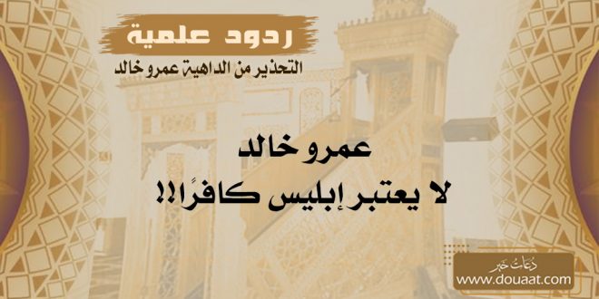 فاسمعوا يا ناس؟ الله وصف إبليس: بـ{الشَيْطَانِ الرَّجيمِ} وبأنه مِنَ الْكَافِرِيِنَ} وبقوله: {فَفَسَقَ عَنْ أمْرِ رِبِّه} وقوله: {أَبَى وَاسْتَكْبَرَ} وبأنه اعترض على الله وأنه طردهُ من الجنة ووصفه بأنه من الصاغرين ووصفه بالغواية {فَبِمَا أَغْوَيْتَنِي} ووصفه بقوله: {مَذْءُومًا مَّدْحُورًا} [سورة الأعراف: 18]، وقال عنه بأنه ومن اتبعه في النار {لأَمْلأنَّ جَهَنَّمَ مِنكُمْ أَجْمَعِينَ} [سورة الأعراف: 18]، وقد لعنه الله {وَإِنَّ عَلَيْكَ اللَّعْنَةَ إِلَى يَوْمِ الدِّينِ} [سورة الحجر: 35]، ووصفه الله بأنه عدو لرسول الله ءادم {فَقُلْنَا يَا آدَمُ إِنَّ هَذَا عَدُوٌّ لَّكَ وَلِزَوْجِك} [سورة طه: 117] ومع ذلك كله يرى عمرو خالد أنه لم يكفر فمن نصدق قول عمرو خالد أم القرءان وبقول مَن نأخذ بالوحي المنزّل على رسول الله أم بآراء عمرو خالد الشاذة. ولا ندري هل سيقول عمرو خالد للناس في شريط مقبل: «تبركوا بولي الله إبليس» ومن يدري فمن صدر منه القول الأول لا يستبعد منه الثاني ولا حول ولا قوة إلا بالله العلي العظيم.