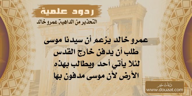 قال عمرو خالد في حلقة عن القدس في القناء المسماة «إقرأ»: وإنما طلب سيدنا موسى أن يدفن على مرمى حجر من الأرض المقدسة وذلك لئلا يأتي أحد من أتباعه ويقول هذه الأرض لنا؛ لأن موسى مدفون فيها.