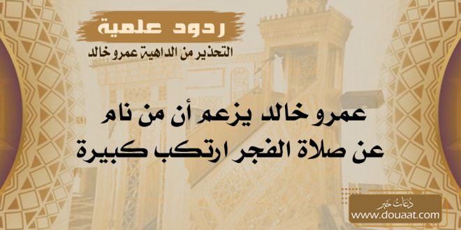 وماذا تقول يا عمرو في الحديث الذي رواه البخاري عن النبي صلى الله عليه وسلم: «ليس في النوم تفريط إنما التفريط على من أخر الصلاة حتى يدخل وقت الصلاة الأخرى» فالحاصل: أن الذي نام قبل الوقت واستغرق كل وقت الصلاة في النوم فلم يستيقظ ليصليها ليس عليه ذنب إنما الإثم على من استيقظ ثم نام ولم يصلِ، ثم إن النبي صلى الله عليه وسلم لم يقيّد فلم يقل ليس في النوم مع المنبه أو مع التوكيل تفريط فمن أين أتيت بهذا القيد. كيف وقد شكت امرأة زوجها إلى رسول الله صلى الله عليه وسلم فقالت: إنه لا يصلي الصبح إلا بعد طلوع الشمس فدافع عن نفسه أنه لا يستيقظ إلا بعد طلوع الشمس فَعَذَرَهُ رسول الله صلى الله عليه وسلم ولم يقل له يجب عليك أن توكل من يوقظك فمن أين أتيت بشرطك الفاسد هذا يا عمرو خالد، أو لم تعلم بأن محرم الحلال كمستحل الحرام.