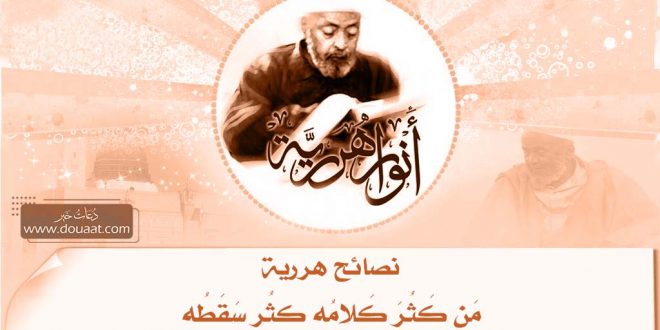 من نصائح العلامة المحدث الشيخ عبد الله الهرري غفر الله له ولوالديه مَن كَثُرَ كَلامُه كثُر سَقَطُه أوصيكم أيضًا بتقليلِ الكلامِ إلا مما هو خيرٌ، قالَ الإمامُ الشافعيُ رضيَ اللهُ عنه: “مَن كَثُرَ كَلامُه كثُر سَقَطُه”، وفي الحديثِ الصّحيحِ أنَّ الرسولَ عليه الصلاةُ والسلامُ كانَ “طويلَ الصمتِ قليلَ الضَحِكِ”. |