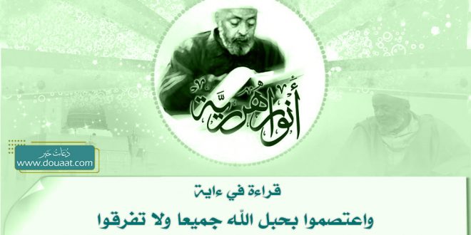 قال الله تعالى: ﴿واعتصموا بحبل الله جميعا ولا تفرقوا﴾ [سورة ءال عمران/103] في هذه الآية الكريمة أمر عظيم وهو الاعتصام والتمسك بما جاء عن الله تبارك وتعالى، وفيها التحذير من التفرق على ما يخالف شرع الله، فإن في الفرقة ضعفا وفي الوحدة قوة.