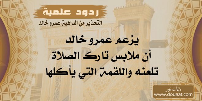 قال عمرو خالد في كتابه المسمّى «عبادات المؤمن» صحيفة (21): «بل إن ملابس تارك الصلاة تلعنه تخيل تقول أخزاك الله لولا أن الله سخرني لك لفررت منك وتلعنه حتى اللقمة التي يأكلها تقول لعنك الله أتأكل من رزق الله ولا تؤدي فريضته».اهـ.