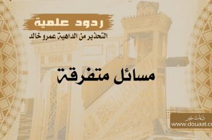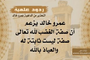 يقول عمرو خالد في كتابه المسمّى «أخلاق المؤمن» (ص202): «فالأصل في صفات الله الرحمة أما الغضب فنتيجة أعمالك وليس صفة لازمة، فصفته اللازمة والدائمة هي الرحمة».اهـ. الرَّدُّ: أنت يا عمرو أتيت بقبائح وفضائح حيث نسبت التغير لله تعالى فمن قال قبلك إن لله صفات لازمة وصفات غير لازمة من أين أتيت بهذا التقسيم القبيح؟! ألا تعلم أن صفات الله تعالى …