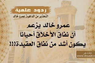يقول عمرو خالد في كتابه المسمّى «أخلاق المؤمن» (129): «إننا لا نقصد هنا نفاق العقيدة – نفاق عبد الله بن أُبي بن سلول أو نفاق المنافقين في المدينة؛ بل – هو نفاق من نوع ءاخر وهو نفاق الأخلاق وأحيانًا يكون هذا النوع أشد من الآخر».اهـ. الرَّدُّ: النفاق نفاقان نفاق العقيدة كما قال والثاني يسمى نفاق العمل. فنفاق العقيدة هو أن …