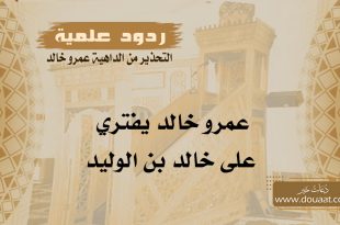 قال في شريط المدينة الرياضية – بيروت يوم الاثنين 11/3/2002ر: «خالد بن الوليد قَتل مجموعة كانوا يستعدون للحرب من الكفار أول ما وصل إليهم وحطوا السيوف وتمكن منهم قالوا: لا إلـٰه إلا الله فقال الرسول: «اللَّهُمَّ إني بريء مما صنع خالد».اهـ. الرَّدُّ: إن هذا الكلام افتراء صريح على الصحابي الجليل خالد بن الوليد t فلقد روى البخاري في صحيحه عن …