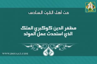 ترجمته هو السلطان الملك المعظم مظفر الدين أبو سعيد كوكبري بن علي بن بكتكين ابن محمد التركماني، أحد الملوك الذين كان ملكهم عزًا للإسلام والمسلمين، وكان له أعمال جليلة وءاثار حسنة منها أنه أول من احتفل بمولد النبي صلى الله عليه وسلم، فكان يوزع فيه الأعطيات والهبات على المسلمين إظهارًا لفرحه بنبي ءاخر الزمان سيدنا محمد عليه أفضل الصلاة وأتم …